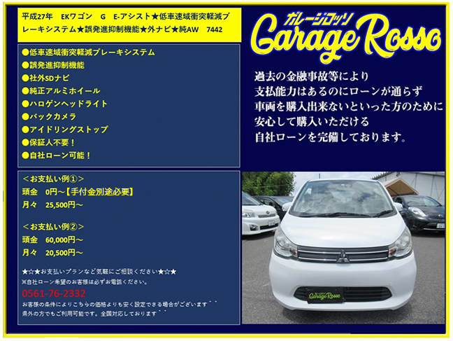 | ●低車速域衝突軽減ブレーキシステム ●誤発進抑制機能 ●社外SDナビ(BT対応)/フルセグ ●純正アルミホイール ●ハロゲンヘッドライト ●バックカメラ ●アイドリングストップ ●保証人不要! ●自社ローン可能! <お支払い例①> 頭金 0円~(手付金別途必要) 月々 25,500円~ <お支払い例②> 頭金 60,000円~ 月々 20,500円~ ★☆★お支払いプランなど気軽にご相談ください★☆★ ☆お支払い例の他にもプランは色々ご相談出来ます☆ ☆ボーナス併用等、プランは色々ご相談出来ます☆ ☆保証人無でもOKです。(契約条件有)☆ ☆頭金を増額頂いた場合、総額より値引き出来ます。☆ ☆保証人をお付けいただいた場合も値引き対象です。☆ ☆その他のお支払いプランご相談に乗ります。☆ 自社ローンの方は事前にお電話下さい☆ 0561-76-2332 |