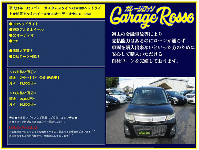 | ●HIDヘッドライト ●純正アルミホイール ●CDオーディオ ●ETC ●保証人不要! ●自社ローン可能! <お支払い例①> 頭金 0円~(手付金別途必要) 月々 15,500円~ <お支払い例②> 頭金 50,000円~ 月々 10,500円~ ★☆★お支払いプランなど気軽にご相談ください★☆★ ☆お支払い例の他にもプランは色々ご相談出来ます☆ ☆ボーナス併用等、プランは色々ご相談出来ます☆ ☆保証人無でもOKです。(契約条件有)☆ ☆頭金を増額頂いた場合、総額より値引き出来ます。☆ ☆保証人をお付けいただいた場合も値引き対象です。☆ ☆その他のお支払いプランご相談に乗ります。☆ 自社ローンの方は事前にお電話下さい☆ 0561-76-2332 |
