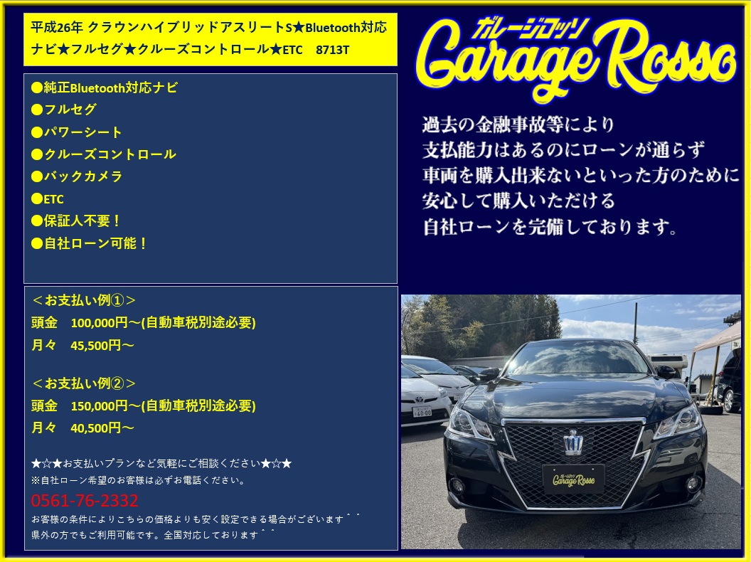 | ●純正Bluetooth対応ナビ ●フルセグ ●パワーシート ●クルーズコントロール ●バックカメラ ●ETC ●保証人不要! ●自社ローン可能! <お支払い例①> 頭金 100,000円~(自動車税別途必要) 月々 45,500円~ <お支払い例②> 頭金 150,000円~(自動車税別途必要) 月々 40,500円~ ★☆★お支払いプランなど気軽にご相談ください★☆★ ☆お支払い例の他にもプランは色々ご相談出来ます☆ ☆ボーナス併用等、プランは色々ご相談出来ます☆ ☆保証人無でもOKです。(契約条件有)☆ ☆頭金を増額頂いた場合、総額より値引き出来ます。☆ ☆保証人をお付けいただいた場合も値引き対象です。☆ ☆その他のお支払いプランご相談に乗ります。☆ 自社ローンの方は事前にお電話下さい☆ 0561-76-2332 |