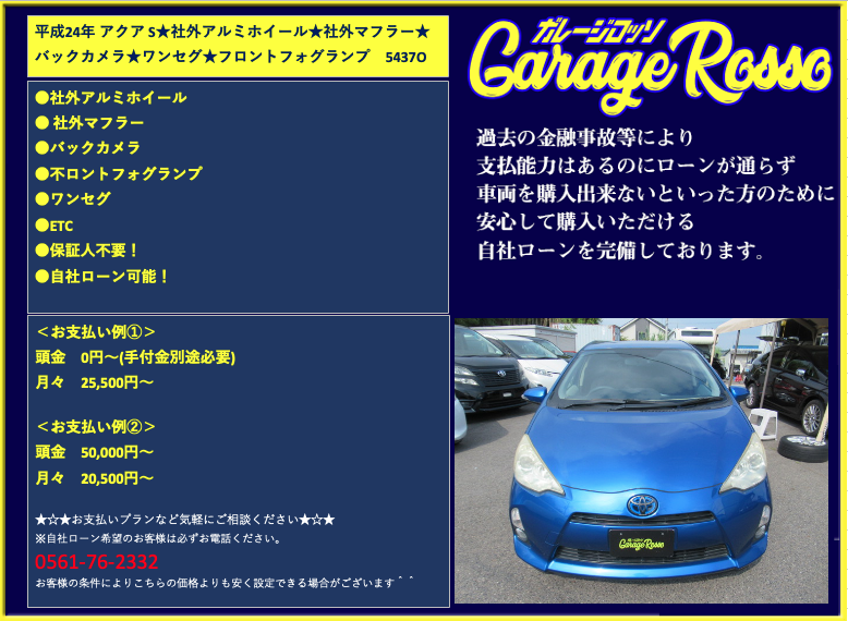 | ●社外アルミホイール ● 社外マフラー ●バックカメラ ●不ロントフォグランプ ●ワンセグ ●ETC ●保証人不要! ●自社ローン可能! <お支払い例①> 頭金 0円~(手付金別途必要) 月々 25,500円~ <お支払い例②> 頭金 50,000円~ 月々 20,500円~ ★☆★お支払いプランなど気軽にご相談ください★☆★ ☆お支払い例の他にもプランは色々ご相談出来ます☆ ☆ボーナス併用等、プランは色々ご相談出来ます☆ ☆保証人無でもOKです。(契約条件有)☆ ☆頭金を増額頂いた場合、総額より値引き出来ます。☆ ☆保証人をお付けいただいた場合も値引き対象です。☆ ☆その他のお支払いプランご相談に乗ります。☆ 自社ローンの方は事前にお電話下さい☆ 0561-76-2332 |
