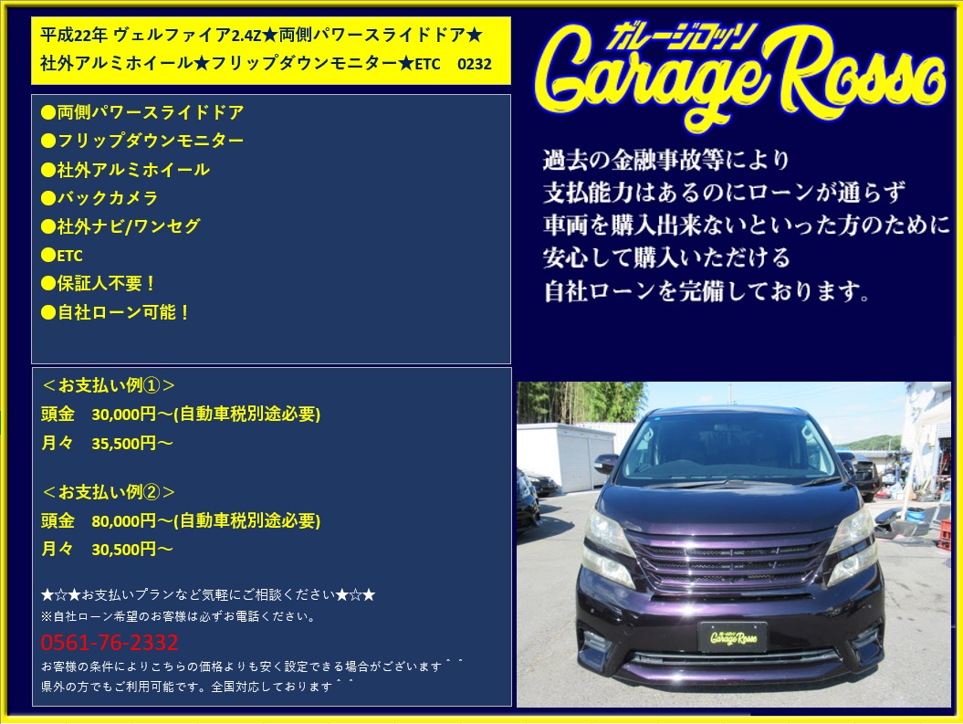 | ●両側パワースライドドア ●フリップダウンモニター ●社外アルミホイール ●バックカメラ ●社外ナビ/ワンセグ ●ETC ●保証人不要! ●自社ローン可能! <お支払い例①> 頭金 30,000円~(別途自動車税必要) 月々 35,500円~ <お支払い例②> 頭金 80,000円~(別途自動車税必要) 月々 30,500円~ ★☆★お支払いプランなど気軽にご相談ください★☆★ ☆お支払い例の他にもプランは色々ご相談出来ます☆ ☆ボーナス併用等、プランは色々ご相談出来ます☆ ☆保証人無でもOKです。(契約条件有)☆ ☆頭金を増額頂いた場合、総額より値引き出来ます。☆ ☆保証人をお付けいただいた場合も値引き対象です。☆ ☆その他のお支払いプランご相談に乗ります。☆ 自社ローンの方は事前にお電話下さい☆ 0561-76-2332 |