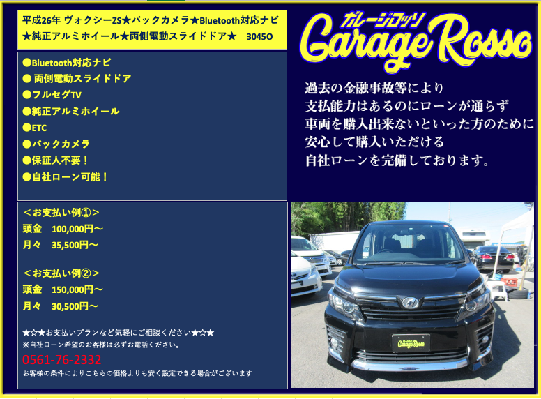 | ●純正アルミホイール ●HIDヘッドライト ●純正Bluetooth対応ナビ/フルセグ ●バックカメラ ●ヒッチメンバー ●両側パワースライドドア ●ETC ●保証人不要! ●自社ローン可能! <お支払い例①> 頭金 100,000円~ 月々 35,500円~ <お支払い例②> 頭金 150,000円~ 月々 30,500円~ ★☆★お支払いプランなど気軽にご相談ください★☆★ ☆お支払い例の他にもプランは色々ご相談出来ます☆ ☆ボーナス併用等、プランは色々ご相談出来ます☆ ☆保証人無でもOKです。(契約条件有)☆ ☆頭金を増額頂いた場合、総額より値引き出来ます。☆ ☆保証人をお付けいただいた場合も値引き対象です。☆ ☆その他のお支払いプランご相談に乗ります。☆ 自社ローンの方は事前にお電話下さい☆ 0561-76-2332 |