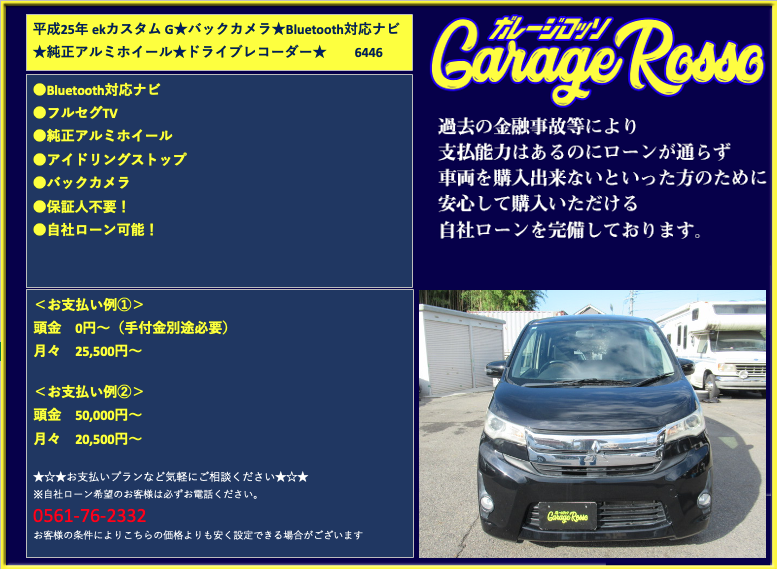 ●純正SDナビ(BT対応)/フルセグ ●純正アルミホイール ●ドライブレコーダー ●HIDヘッドライト ●バックカメラ ●アイドリングストップ ●保証人不要! ●自社ローン可能! <お支払い例①> 頭金 0円~(手付金別途必要) 月々 25,500円~ <お支払い例②> 頭金 50,000円~ 月々 20,500円~ ★☆★お支払いプランなど気軽にご相談ください★☆★ ☆お支払い例の他にもプランは色々ご相談出来ます☆ ☆ボーナス併用等、プランは色々ご相談出来ます☆ ☆保証人無でもOKです。(契約条件有)☆ ☆頭金を増額頂いた場合、総額より値引き出来ます。☆ ☆保証人をお付けいただいた場合も値引き対象です。☆ ☆その他のお支払いプランご相談に乗ります。☆ 自社ローンの方は事前にお電話下さい☆ 0561-76-2332 |