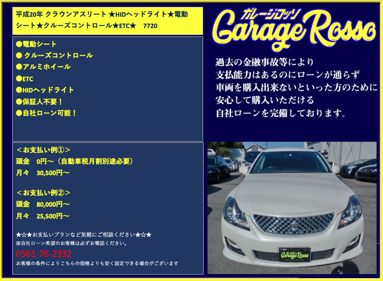 | ●HIDヘッドライト ●電動シート ●クルーズコントロール ●アルミホイール ●ETC ●保証人不要! ●自社ローン可能! <お支払い例①> 頭金 0円~(月割り自動車税別途必要) 月々 30,500円~ <お支払い例②> 頭金 80,000円~ 月々 25,500円~ ★☆★お支払いプランなど気軽にご相談ください★☆★ ☆お支払い例の他にもプランは色々ご相談出来ます☆ ☆ボーナス併用等、プランは色々ご相談出来ます☆ ☆保証人無でもOKです。(契約条件有)☆ ☆頭金を増額頂いた場合、総額より値引き出来ます。☆ ☆保証人をお付けいただいた場合も値引き対象です。☆ ☆その他のお支払いプランご相談に乗ります。☆ 自社ローンの方は事前にお電話下さい☆ 0561-76-2332 |