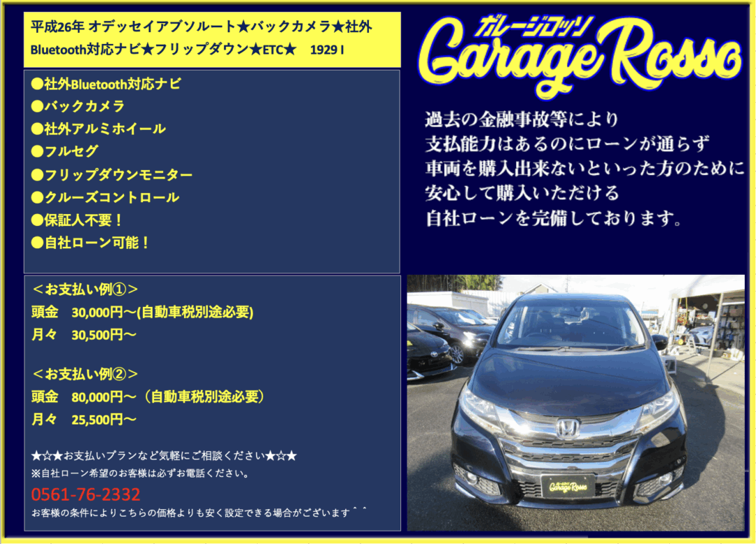 | ●社外Bluetooth対応ナビ ●バックカメラ ●社外アルミホイール ●フルセグ ●フリップダウンモニター ●クルーズコントロール ●保証人不要! ●自社ローン可能! <お支払い例①> 頭金 30,000円~(自動車税別途必要) 月々 30,500円~ <お支払い例②> 頭金 80,000円~(自動車税別途必要) 月々 25,500円~ ★☆★お支払いプランなど気軽にご相談ください★☆★ ☆お支払い例の他にもプランは色々ご相談出来ます☆ ☆ボーナス併用等、プランは色々ご相談出来ます☆ ☆保証人無でもOKです。(契約条件有)☆ ☆頭金を増額頂いた場合、総額より値引き出来ます。☆ ☆保証人をお付けいただいた場合も値引き対象です。☆ ☆その他のお支払いプランご相談に乗ります。☆ 自社ローンの方は事前にお電話下さい☆ 0561-76-2332 |