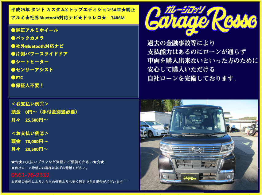 | ●純正アルミホイール ●バックカメラ ●社外Bluetooth対応ナビ ●片側パワースライドドア ●シートヒーター ●センサーアシスト ●ETC ●保証人不要! ●自社ローン可能! <お支払い例①> 頭金 0円~(手付金別途必要) 月々 25,500円~ <お支払い例②> 頭金 70,000円~ 月々 20,500円~ ★☆★お支払いプランなど気軽にご相談ください★☆★ ☆お支払い例の他にもプランは色々ご相談出来ます☆ ☆ボーナス併用等、プランは色々ご相談出来ます☆ ☆保証人無でもOKです。(契約条件有)☆ ☆頭金を増額頂いた場合、総額より値引き出来ます。☆ ☆保証人をお付けいただいた場合も値引き対象です。☆ ☆その他のお支払いプランご相談に乗ります。☆ 自社ローンの方は事前にお電話下さい☆ 0561-76-2332 |