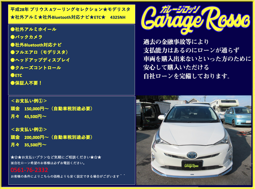 | ●社外アルミホイール ●バックカメラ ●社外Bluetooth対応ナビ ●フルエアロ(モデリスタ) ●ヘッドアップディスプレイ ●クルーズコントロール ●ETC ●保証人不要! ●自社ローン可能! <お支払い例①> 頭金 150,000円~(自動車税別途必要) 月々 40,500円~ <お支払い例②> 頭金 200,000円~(自動車税別途必要) 月々 35,500円~ ★☆★お支払いプランなど気軽にご相談ください★☆★ ☆お支払い例の他にもプランは色々ご相談出来ます☆ ☆ボーナス併用等、プランは色々ご相談出来ます☆ ☆保証人無でもOKです。(契約条件有)☆ ☆頭金を増額頂いた場合、総額より値引き出来ます。☆ ☆保証人をお付けいただいた場合も値引き対象です。☆ ☆その他のお支払いプランご相談に乗ります。☆ 自社ローンの方は事前にお電話下さい☆ 0561-76-2332 |