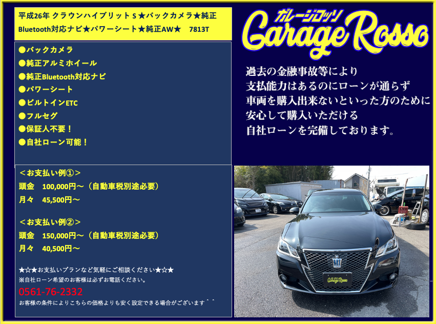 | ●純正Bluetooth対応ナビ ●フルセグ ●パワーシート ●クルーズコントロール ●バックカメラ ●ETC ●保証人不要! ●自社ローン可能! <お支払い例①> 頭金 100,000円~(自動車税別途必要) 月々 45,500円~ <お支払い例②> 頭金 150,000円~(自動車税別途必要) 月々 40,500円~ ★☆★お支払いプランなど気軽にご相談ください★☆★ ☆お支払い例の他にもプランは色々ご相談出来ます☆ ☆ボーナス併用等、プランは色々ご相談出来ます☆ ☆保証人無でもOKです。(契約条件有)☆ ☆頭金を増額頂いた場合、総額より値引き出来ます。☆ ☆保証人をお付けいただいた場合も値引き対象です。☆ ☆その他のお支払いプランご相談に乗ります。☆ 自社ローンの方は事前にお電話下さい☆ 0561-76-2332 |