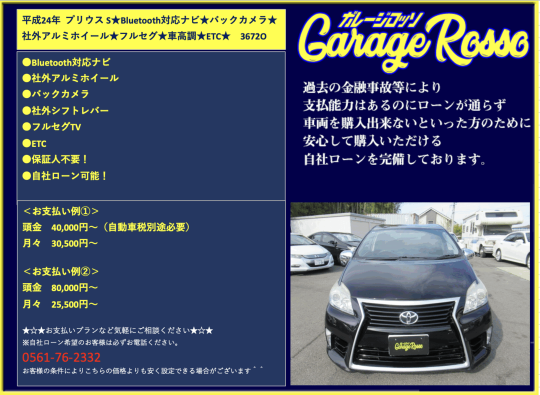 | ●Bluetooth対応ナビ ●社外アルミホイール ●バックカメラ ●社外シフトレバー ●フルセグTV ●ETC ●保証人不要! ●自社ローン可能! <お支払い例①> 頭金 40,000円~(自動車税別途必要) 月々 30,500円~ <お支払い例②> 頭金 80,000円~(自動車税別途必要) 月々 25,500円~ ★☆★お支払いプランなど気軽にご相談ください★☆★ ☆お支払い例の他にもプランは色々ご相談出来ます☆ ☆ボーナス併用等、プランは色々ご相談出来ます☆ ☆保証人無でもOKです。(契約条件有)☆ ☆頭金を増額頂いた場合、総額より値引き出来ます。☆ ☆保証人をお付けいただいた場合も値引き対象です。☆ ☆その他のお支払いプランご相談に乗ります。☆ 自社ローンの方は事前にお電話下さい☆ 0561-76-2332 |