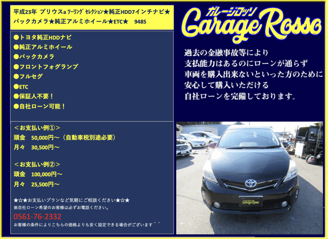 | ●トヨタ純正HDDナビ ●純正アルミホイール ●バックカメラ ●フロントフォグランプ ●フルセグ ●ETC ●保証人不要! ●自社ローン可能! <お支払い例①> 頭金 50,000円~(自動車税別途必要) 月々 30,500円~ <お支払い例②> 頭金 100,000円~(自動車税別途必要) 月々 25,500円~ ★☆★お支払いプランなど気軽にご相談ください★☆★ ☆お支払い例の他にもプランは色々ご相談出来ます☆ ☆ボーナス併用等、プランは色々ご相談出来ます☆ ☆保証人無でもOKです。(契約条件有)☆ ☆頭金を増額頂いた場合、総額より値引き出来ます。☆ ☆保証人をお付けいただいた場合も値引き対象です。☆ ☆その他のお支払いプランご相談に乗ります。☆ 自社ローンの方は事前にお電話下さい☆ 0561-76-2332 |
