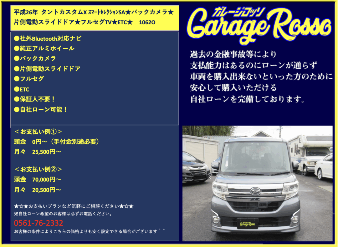 | ●社外Bluetooth対応ナビ ●純正アルミホイール ●バックカメラ ●片側電動スライドドア ●フルセグ ●ETC ●保証人不要! ●自社ローン可能! <お支払い例①> 頭金 0円~(手付金別途必要) 月々 25,500円~ <お支払い例②> 頭金 70,000円~ 月々 20,500円~ ★☆★お支払いプランなど気軽にご相談ください★☆★ ☆お支払い例の他にもプランは色々ご相談出来ます☆ ☆ボーナス併用等、プランは色々ご相談出来ます☆ ☆保証人無でもOKです。(契約条件有)☆ ☆頭金を増額頂いた場合、総額より値引き出来ます。☆ ☆保証人をお付けいただいた場合も値引き対象です。☆ ☆その他のお支払いプランご相談に乗ります。☆ 自社ローンの方は事前にお電話下さい☆ 0561-76-2332 |